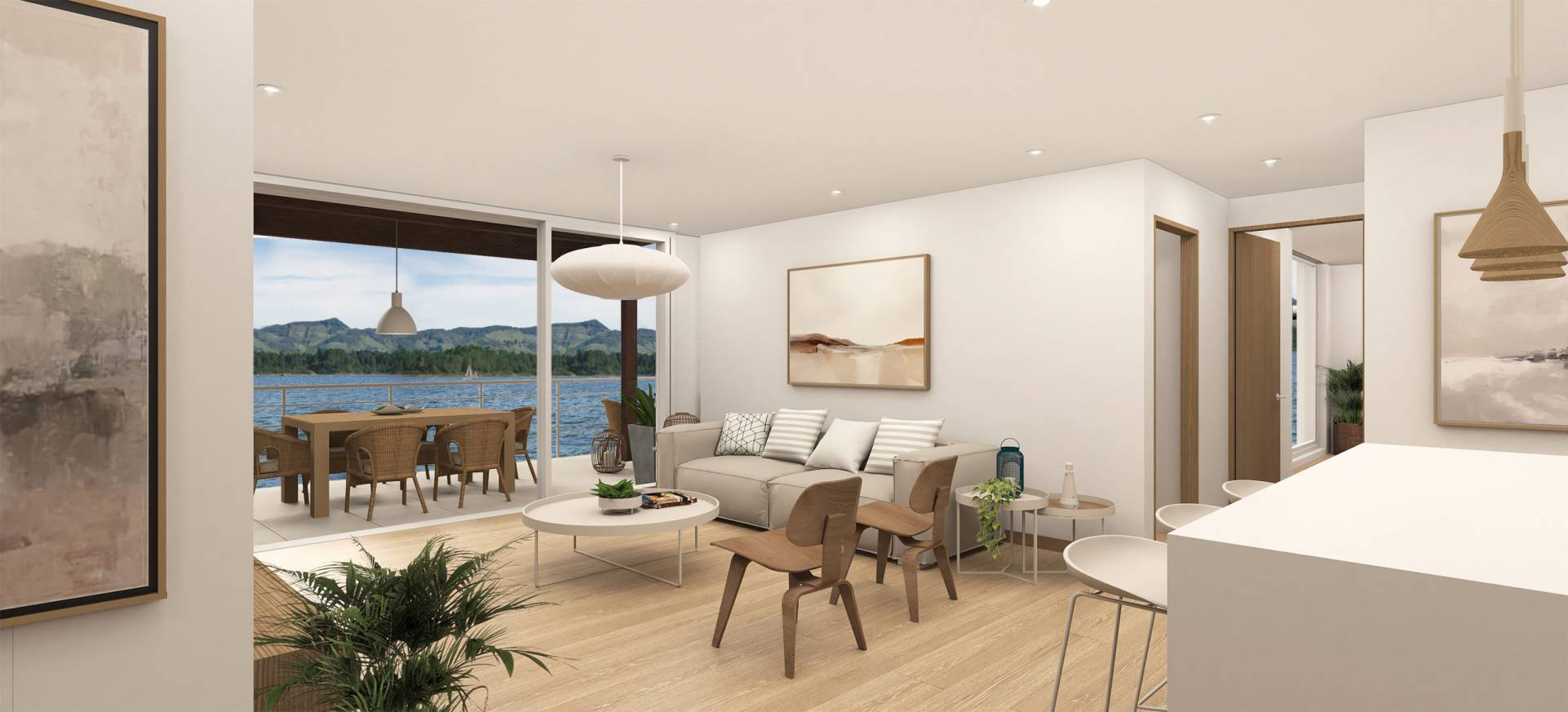Al entrar encuentras un espacio luminoso que te proyecta hacia la represa con su vista panorámica integrada en el espacio, tanto desde la cocina abierta, como desde las alcobas y desde el area social.