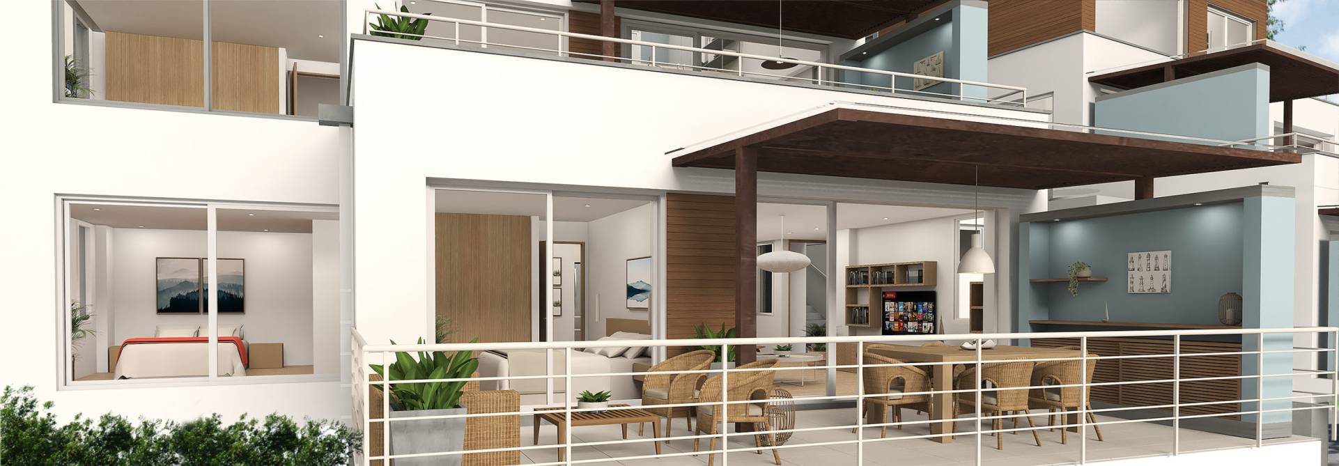 Nivel -2.80 de acceso . Salón comedor . Cocina abierta con barra . Baño social familiar . Cuarto de ropas . Alcoba principal con baño . Segunda alcoba . Terraza frontal con nicho multifuncional