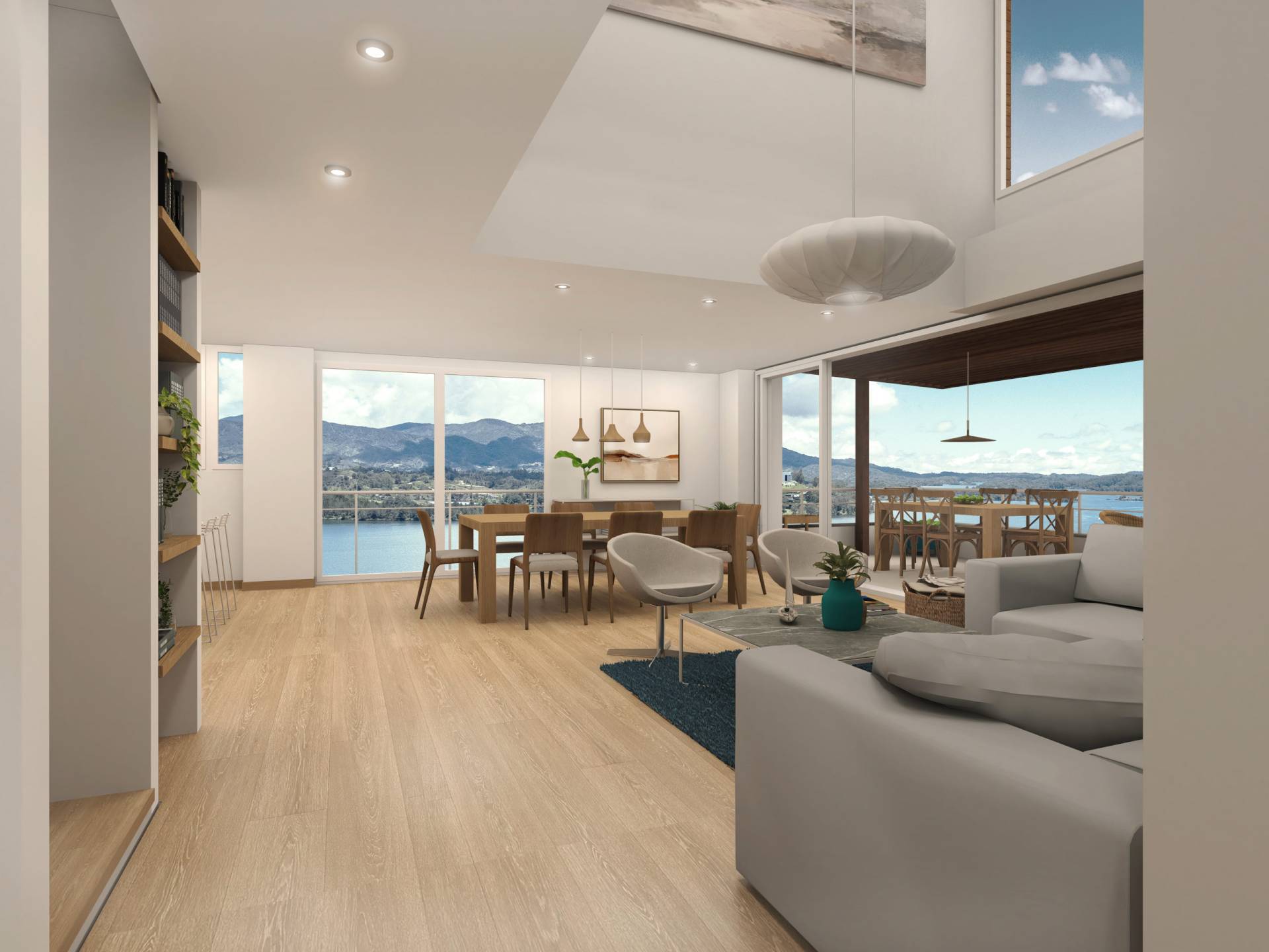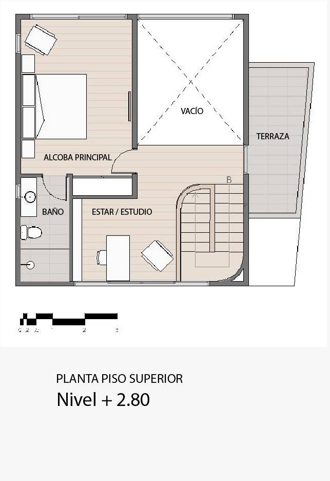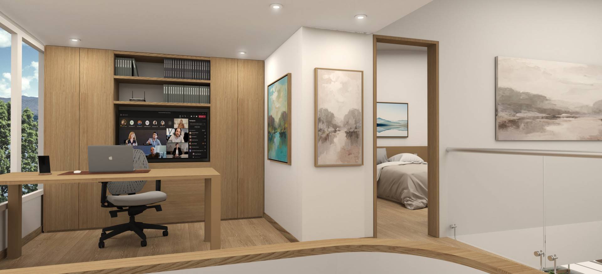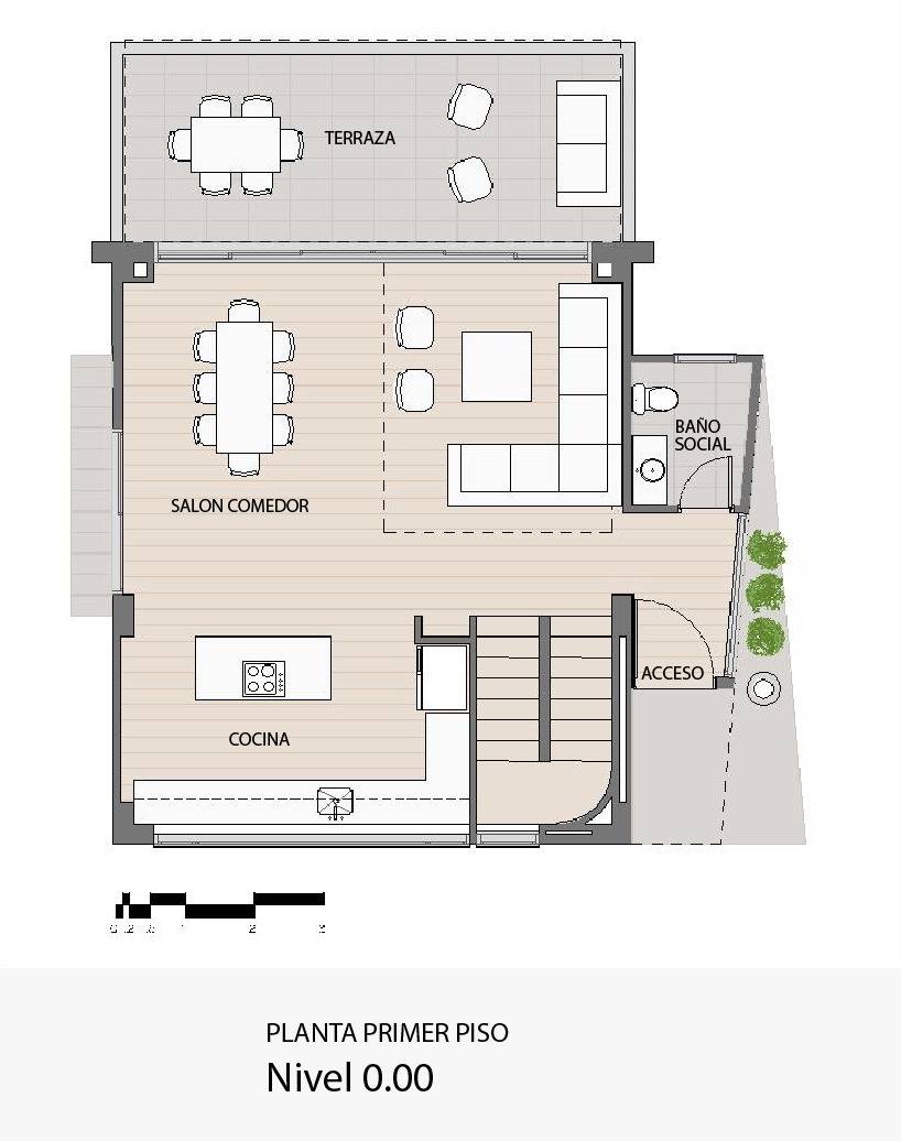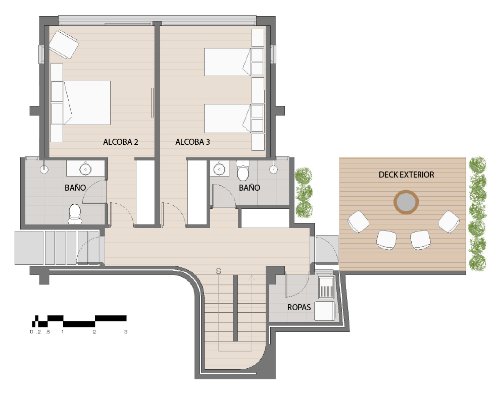 Nivel 00 de acceso . Salón comedor • Cocina abierta con barra . Baño social . Terraza frontal Nivel – 2.80 . Alcoba 2 con baño y Alcoba 3 . Baño familiar . Zona de ropas . Salida a terreno de uso exclusivo Nivel + 2.80 .Alcoba principal con baño .Estar / Estudio