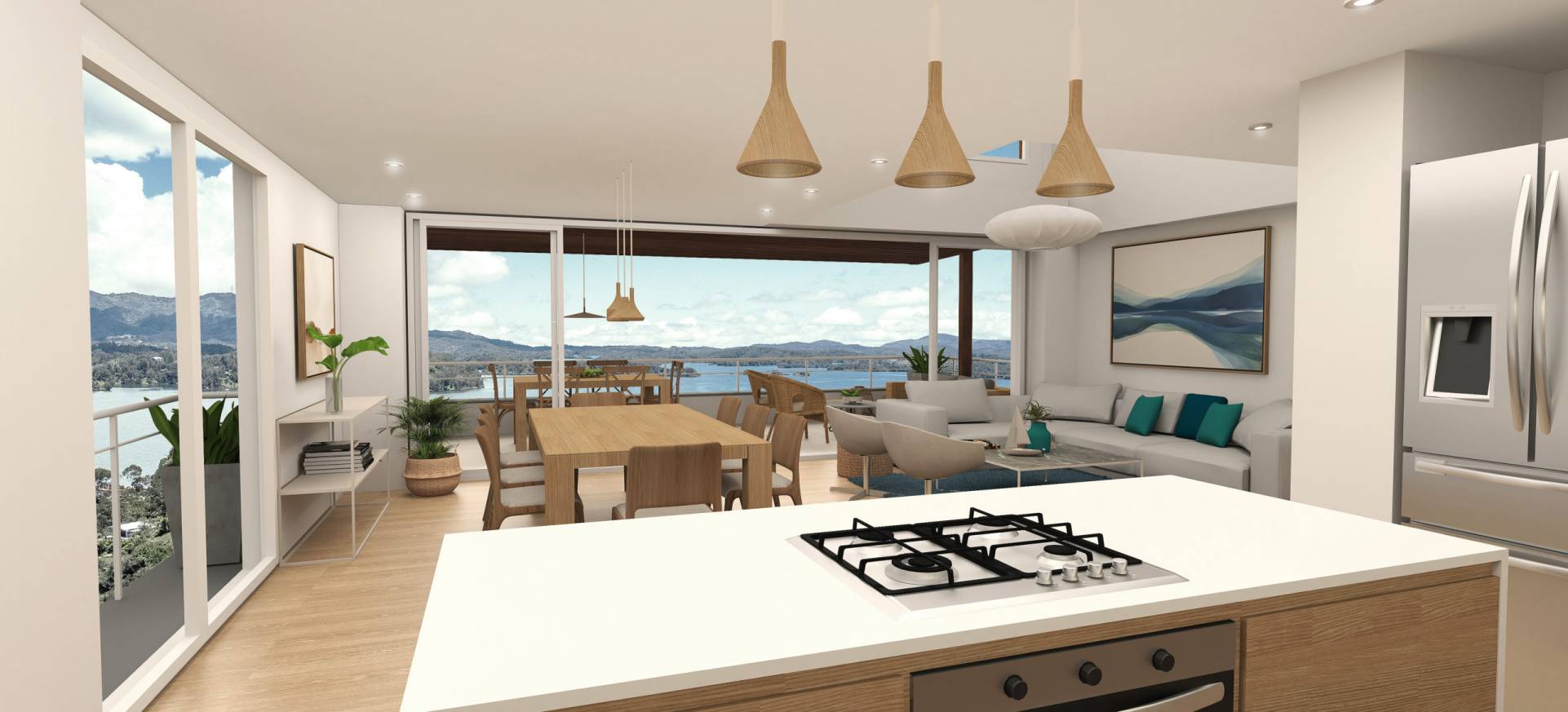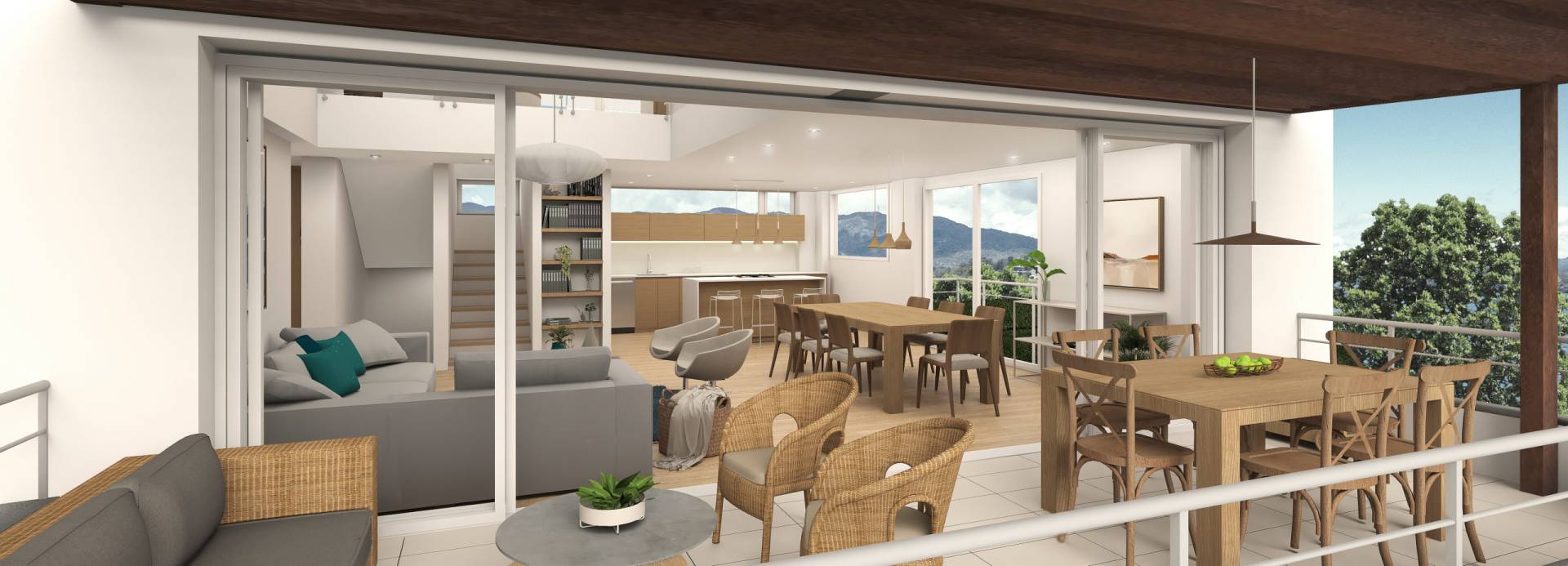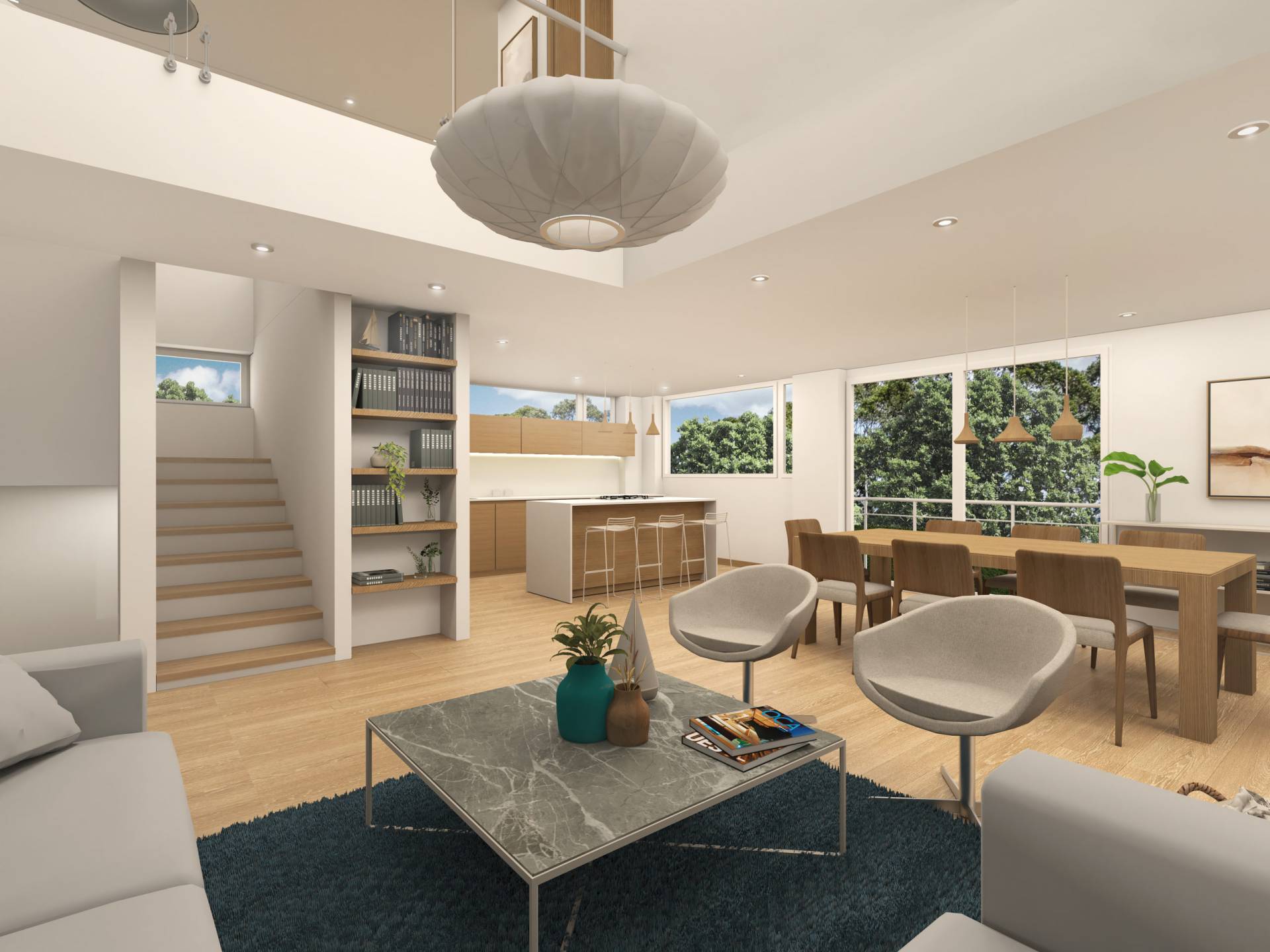 Nivel 00 de acceso . Salón comedor • Cocina abierta con barra . Baño social . Terraza frontal Nivel – 2.80 . Alcoba 2 con baño y Alcoba 3 . Baño familiar . Zona de ropas . Salida a terreno de uso exclusivo Nivel + 2.80 .Alcoba principal con baño .Estar / Estudio