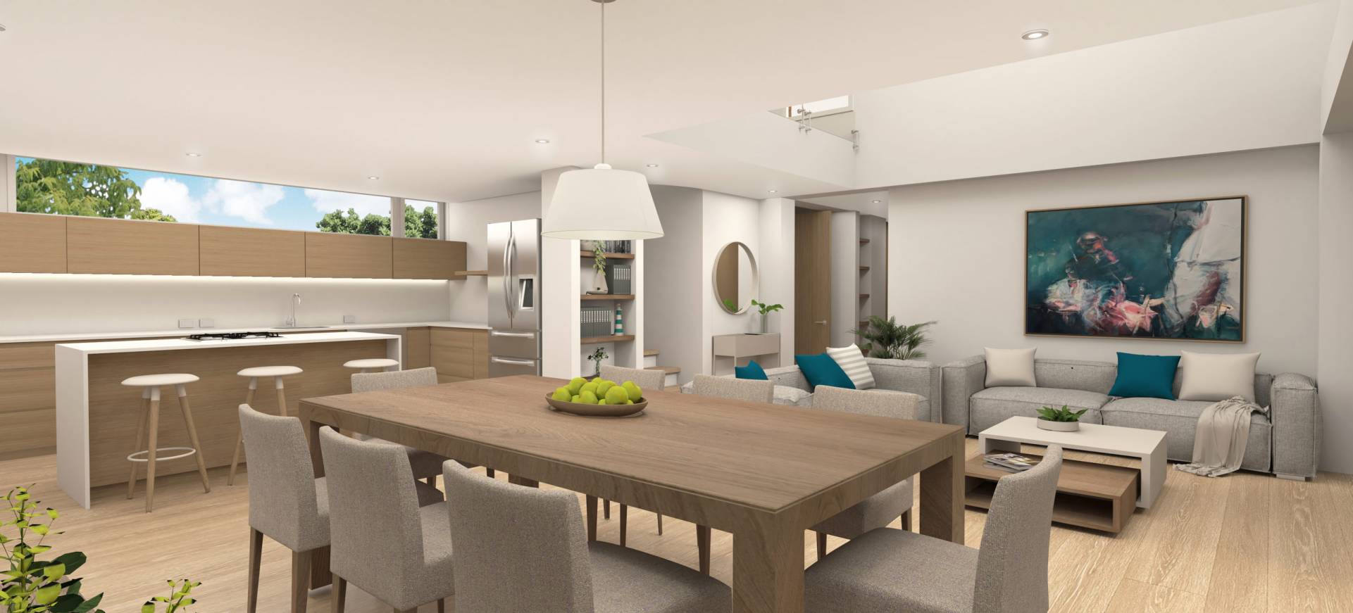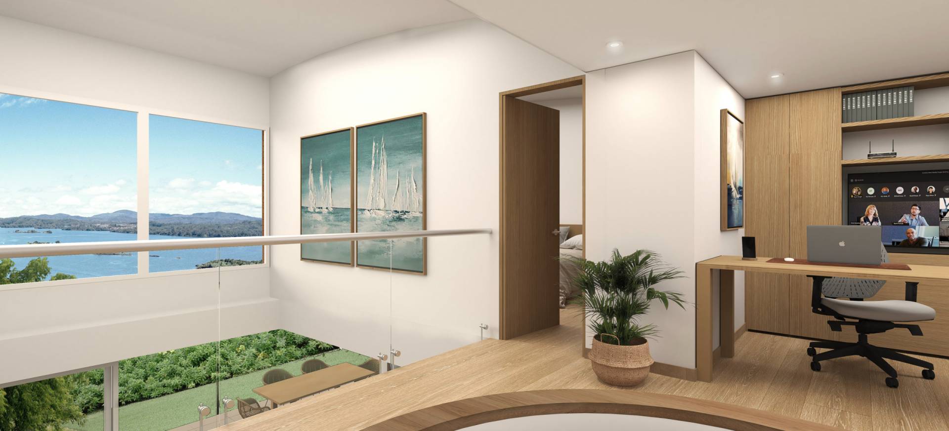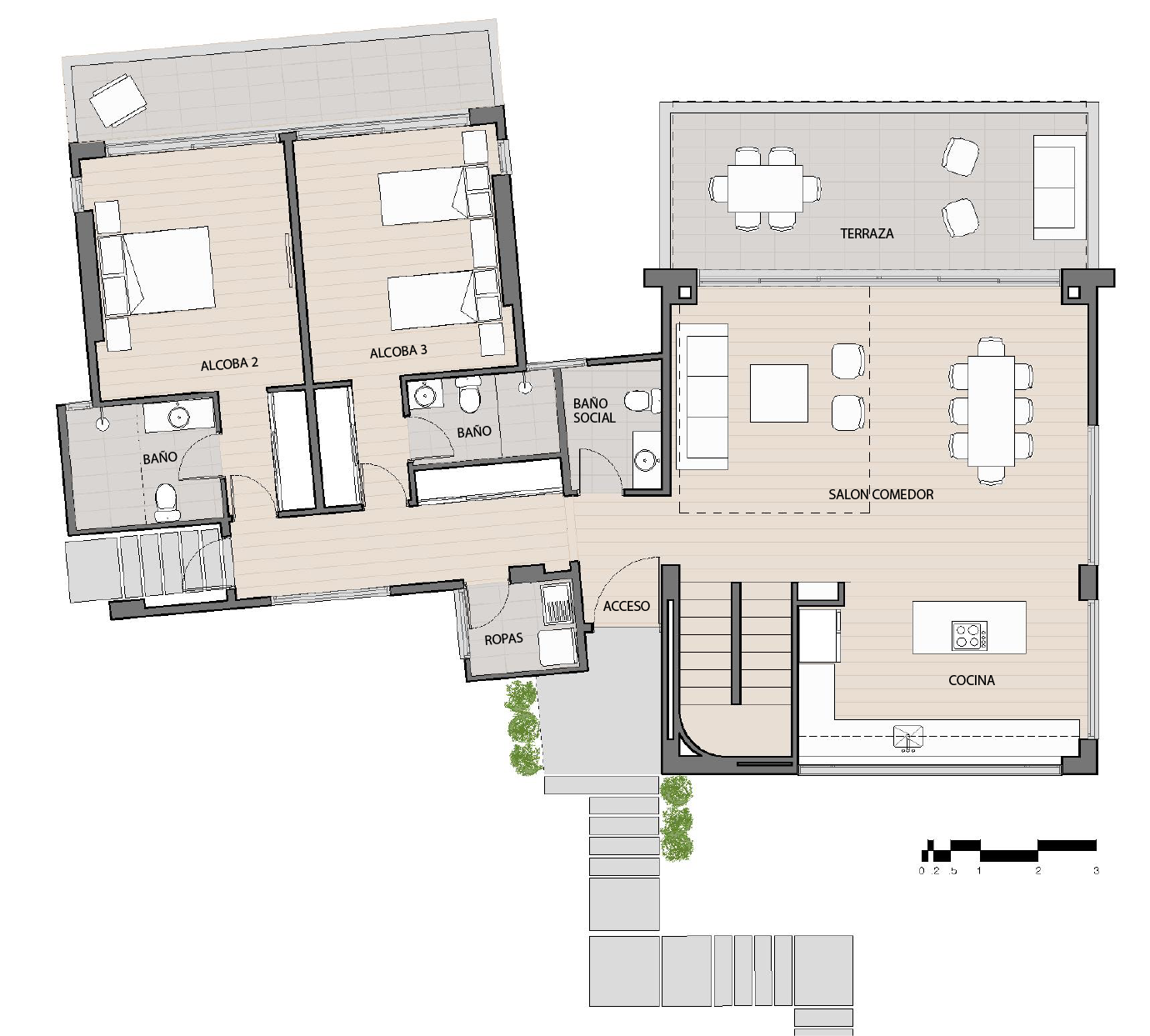 Nivel 00 de acceso . Salón comedor • Cocina abierta con barra . Baño social . Terraza frontal . Alcoba 2 con baño y alcoba 3 con baño . Zona de ropas . Salida a terreno de uso exclusivo Nivel +2.80 . Alcoba principal con baño . Estar / Estudio